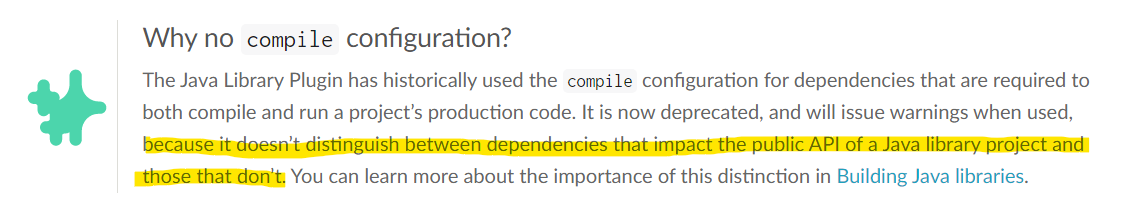 compile configuration이 Java 라이브러리 프로젝트의 공용 API에 영향을 미치는 종속성과 그렇지 않은 종속성을 구분하지 않기 때문에 권장하지 않았나보네요.
