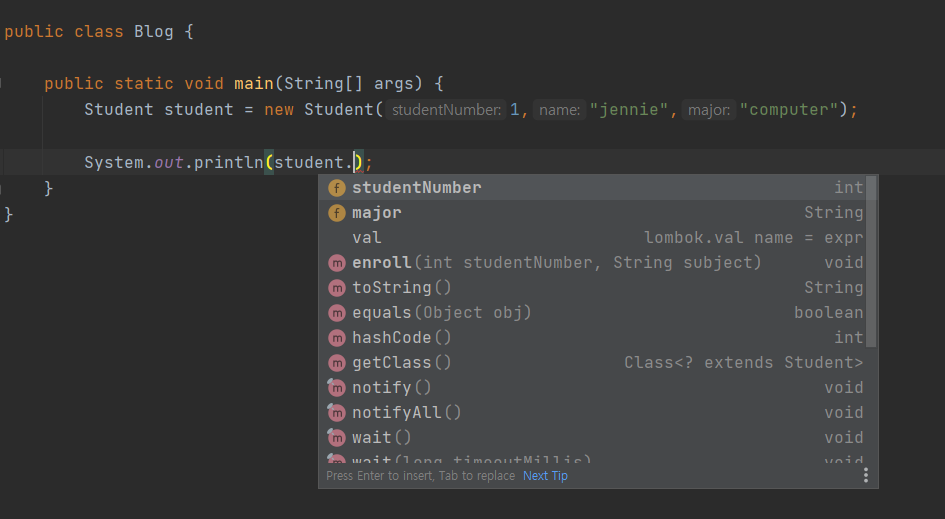 사진을 보면 살짝 의아한 점이 있죠?? student 객체에는 studentNumber와 name,major 속성들이 있는데 name에는 접근할 수 없습니다. 아까 Student 클래스에서 name 변수를 private으로 정의했기 때문입니다. private 속성에 접근하고 싶으시다면 getter와 setter를 이용하시면 됩니다.