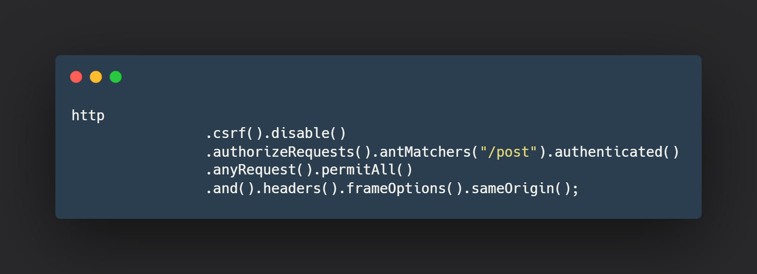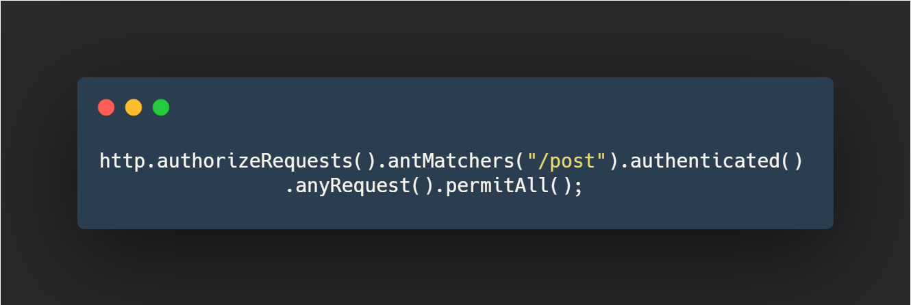 antMetchers를 이용하는 방식은 여러가지 응용이 가능합니다. 글을 작성하는 기능은 로그인을 한 사용자만 가능하다면 아래처럼 코드를 수정해서 제어할 수 있습니다.