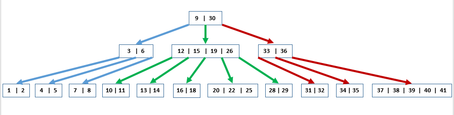 각 노드는 일련의 키와 여러 개의 자식 (자식 노드)을 가질 수 있다. 여기서 자식의 수는 0 또는 해당 키의 총 수에 1을 더한 값이 될 수 있다. 노드 [x]를 생각해보자. node [x]가 잎 노드 인 경우는 자식을 가지지 다 이것이 내부 노드인 경우 전체 자식 수는 n [x] + 1이다. 여기서 n [x]는 해당 키의 총 수이다.
