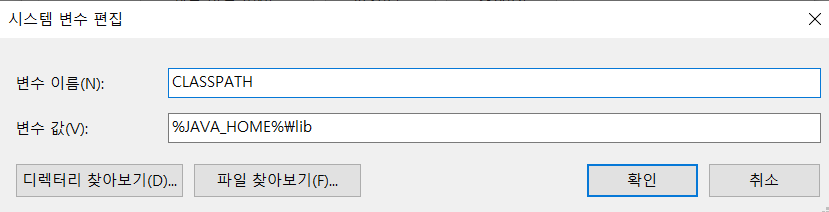 시스템 변수 새로 만들기를 통해서 변수 이름에는 CLASSPATH 변수 값에는 jdk 폴더 경로\lib 를 입력해줍시다. 아니면 JAVA_HOME 변수가 있으신 분들은 이렇게 응용도 가능하죠.