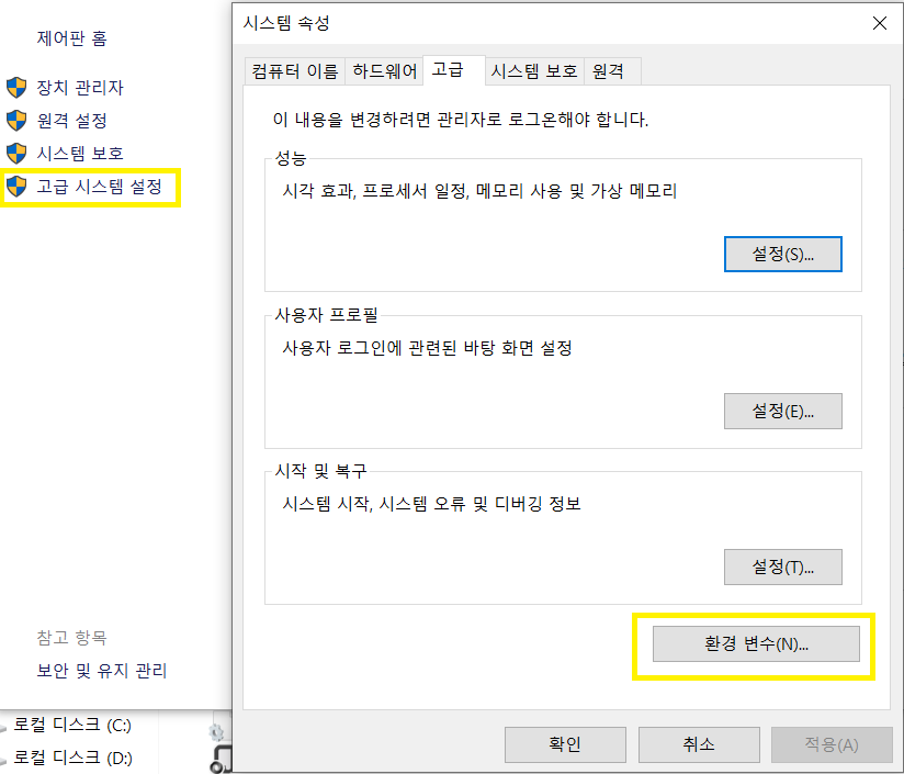 파일 탐색기에서 내PC 우클릭 -> 속성 -> 고급 시스템 설정 -> 환경 변수를 차례대로 선택해주세요.