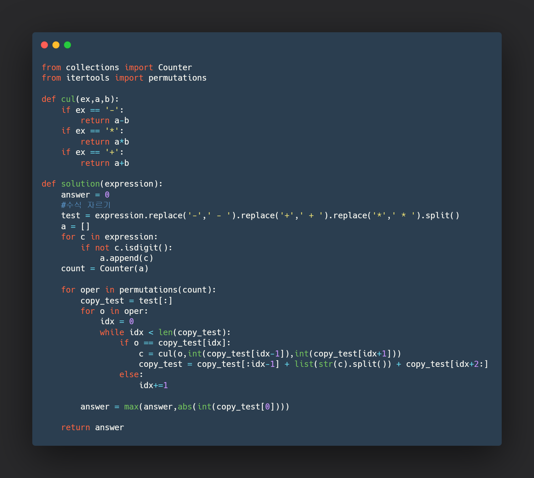 그렇게 완성된 코드입니다. python의 경우 permutations를 이용해서 순열을 구할 수 있습니다. 현재는 우선순위에 따른 '순서'가 필요하니 조합이 아니라 순열을 이용했습니다. 또 원래는 막 stack에 넣다뺐다 막 그랬는데 python list 슬라이싱..?을 이용하도록 수정했습니다. 참고로 저는 연산자에 따라서 계산하는 함수를 따로 만들어서 사용했는데요. 심지어 문자열이라서 일일이 int형으로 고쳐줬습니다만.. python에 eval이라는 함수를 이용하면 문자열 수식을 계산할 수 있다는 사실.. 두둥..