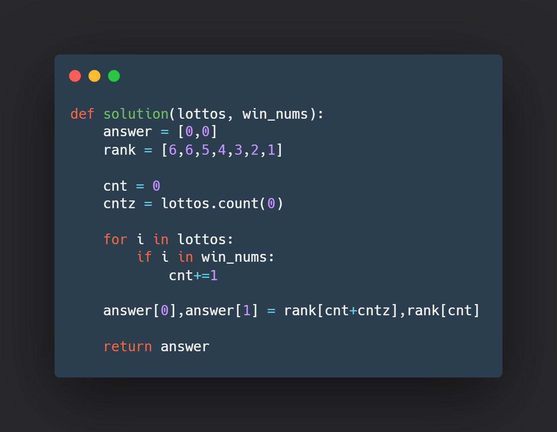 자 간단합니다. lottos 배열과 win_nums 배열을 비교해서 총 몇개가 매칭이 되었는지 카운팅해줍니다. 그리고 0에 들어갈 숫자가 모두 당첨 번호와 관련이 없다면 최소 순위를 알 수 있죠. 그 다음 0이 모두 맞았다면 그건 최대 등수가 되겠구요. 일치 번호 카운팅과 0 개수 카운팅을 해주면 되는 문제입니다.