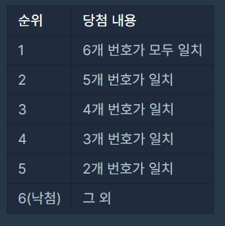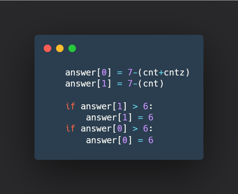 다른 사람들의 풀이를 보자마자 아..!! 하고 깨달았습니다. 해답은 바로 rank = [6,6,5,4,3,2,1] 배열을 따로 만들어두는 것!! 오! 굉장히 직관적이면서도 간단한 방법 아닌가요?? 진짜 구현 문제는 아이디어만 잘 떠올리면 더 간편하게 풀 수 있어서 재밌네요.