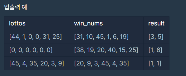 lottos는 내가 보유한 로또 번호 win_nums는 당첨 로또 번호입니다. lottos 배열의 0은 지워져서 알 수 없는 번호이고 0을 고려해서 최대 등수와 최소 등수를 계산하는 문제입니다.