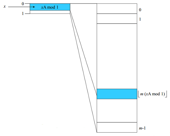 곱하기 방법은 이와 반대로 먼저 입력값을 0과 1 사이의 소수로 대응시킨 다음 해시 테이블 크기 m을 곱하여 0~m-1 사이로 팽창시킨다. 이 방법에서는 해쉬 함수의 특성을 결정짓는 0<A<1 의 범위의 상수 A를 미리 준비해야 한다. 임의의 원소 x에 대해 다음과 같은 과정을 거쳐 x의 주소를 결정한다.