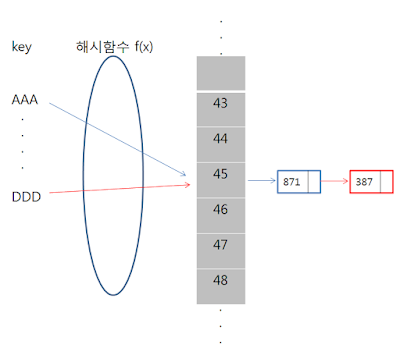 아래 그림을 보자. AAA는 먼저 해시 테이블에 871이란 데이터를 저장한다. 뒤이어 DDD가 충돌이 발생하는데, 연결리스트를 이용해 동일한 45번 자리에 데이터를 연결시켜 저장한다.
