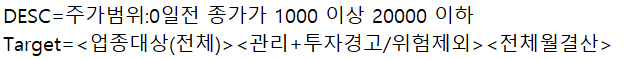 Target=<업종대상(전체)><관리+투자경고/위험제외><전체월결산>' 이런 데이터가 들어갔습니다.