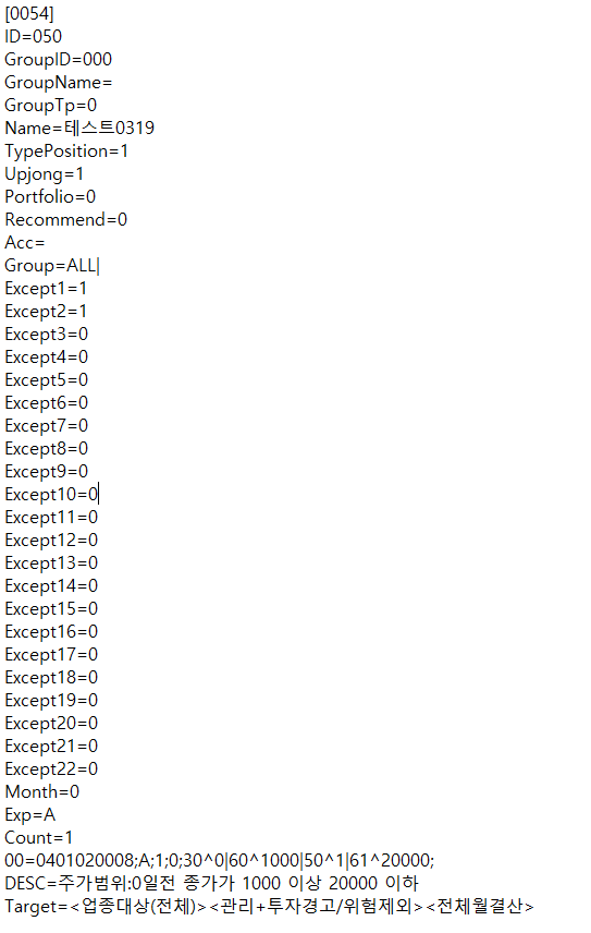 대괄호 영역부터 Target까지가 테스트0319라는 조건식을 이루는 한 덩어리이니 이것을 통으로 복사해서 전달해주면 받는 사람이 그 데이터를 그대로 저장해서 쓰면 되지 않을까 하는 추측입니다. SaveIndexCombo.dat와 SaveIndexCombo_Order.dat 파일도 수정은 필요하겠죠.
