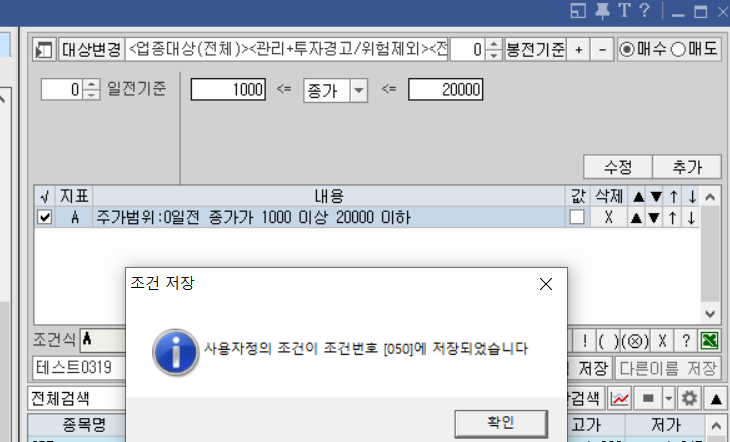 제 테스트0319 조건식에는'ID=050DESC=주가범위:0일전 종가가 1000 이상 20000 이하,
