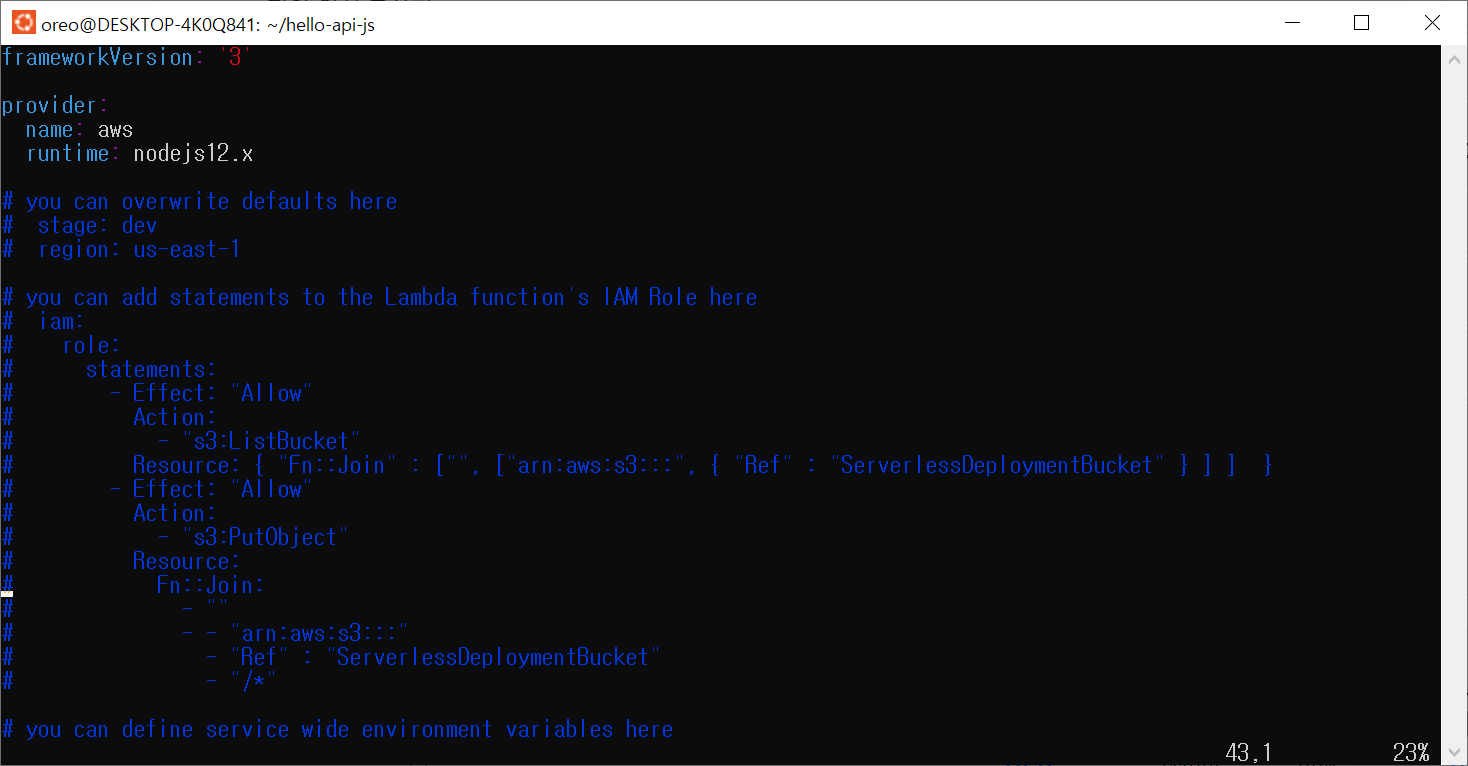 serverless.yml 파일을 살펴보면 기본 스펙 외에도 주석처리로 다양한 내용이 적혀있습니다. 이를 참고해서 서버리스 스택을 생성할 때 참고하시면 됩니다.
