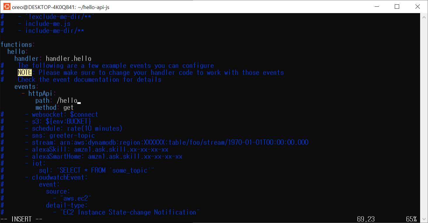 일단 serverless.yml 파일부터 수정해야 합니다. Lambda 함수는 HTTP 이벤트를 포함해서 다양한 이벤트를 실행할 수 있습니다. 그러나 serverless.yml 파일을 보면 events가 주석처리가 되어있을 거예요. 그러면 이벤트가 연결이 안 되어있는 상태라서 반응을 하지 않습니다. 주석을 지워서 httpApi를 받도록 설정해 줍시다. GET /hello 요청에 반응하도록 path를 수정해 줬어요. 이제 handler.hello 함수를 GET /hello의 HTTP 요청을 통해 실행할 수 있습니다.