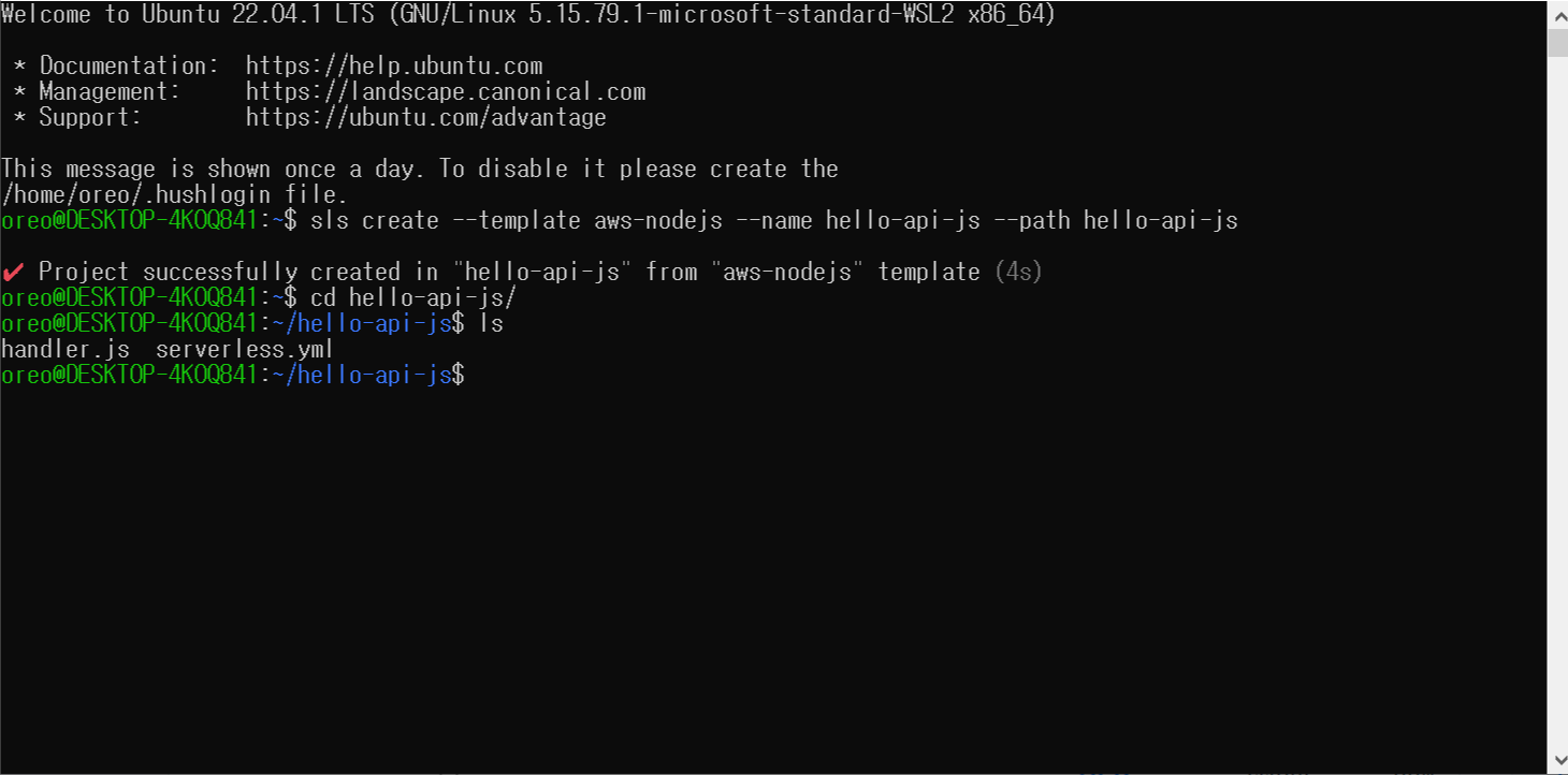 이번에는 지난번과 달리 sls create 명령어로 프로젝트를 생성해볼게요. aws-nodejs 템플릿을 hello-api-js라는 프로젝트명을 지정합니다. 이 프로젝트는 --path 에 적힌 디렉터리에 다운로드됩니다. 대화형으로 프로젝트를 만들 때와는 다른 점이 몇 가지 있습니다. 일단 README.md 파일이 없네요.