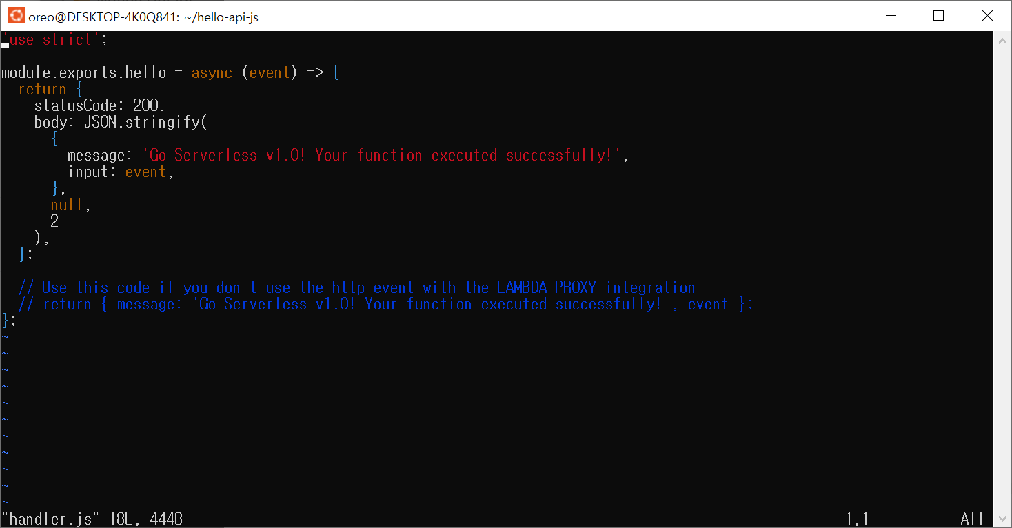 이제는 handler.js를 수정해줄 차례입니다. 현재는 hello에 들어오면 무조건 200 상태와 Go Serverless... 메시지를 출력해주고 있습니다.