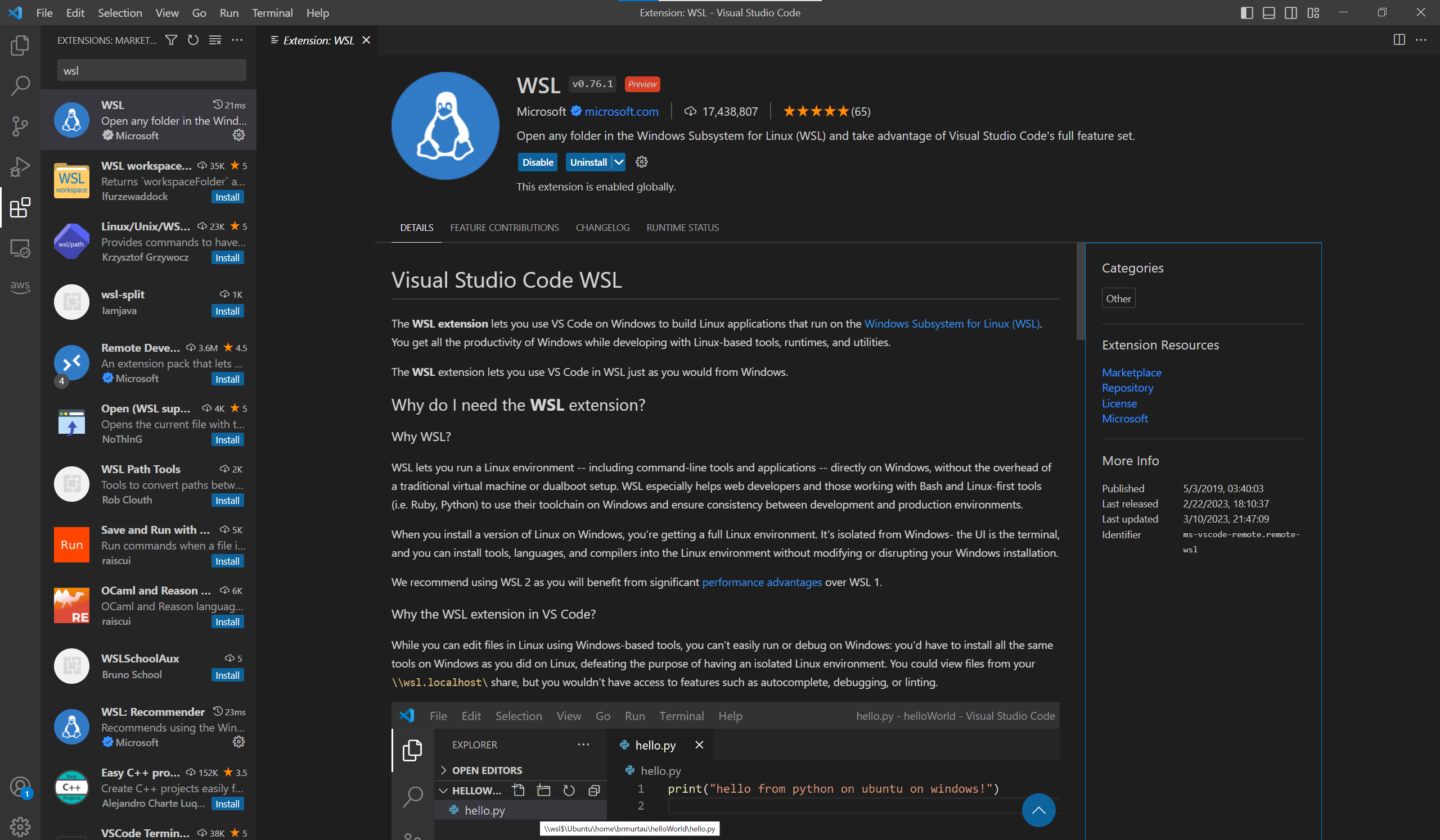 Ctrl + Shift + X 를 눌러서 Extension 검색창을 킵니다. 여기에 WSL을 검색하고 Microsoft 사에서 배포하는 WSL을 Install 해주시면 됩니다.