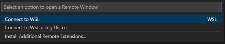 제대로 설치가 된 경우에는 좌측 하단에 초록색의 저 아이콘이 생기게 됩니다. 우리는 저 친구를 눌러서 WSL에 연결할 수 있습니다.