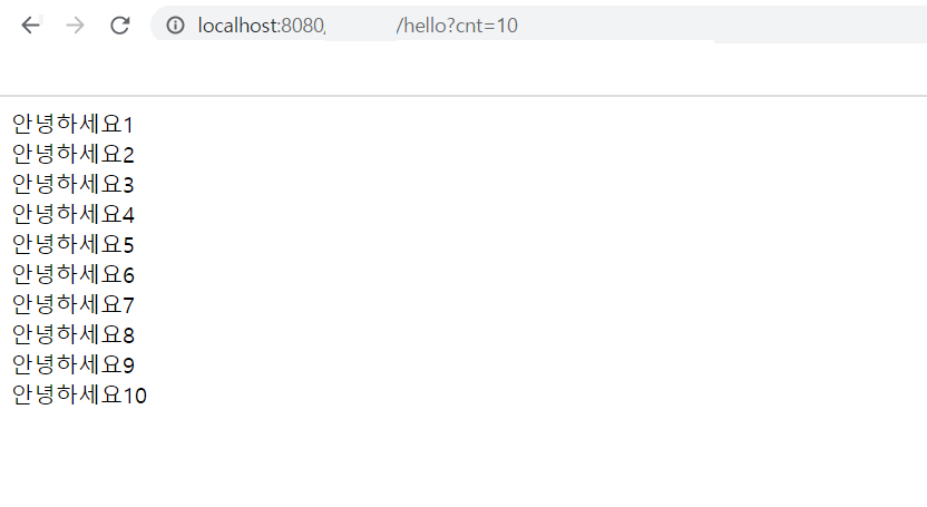 url을 살짝 변경해볼게요. http://localhost:8080/Newlec/hello?cnt=10로 수정을 하면 10번 출력됩니다.