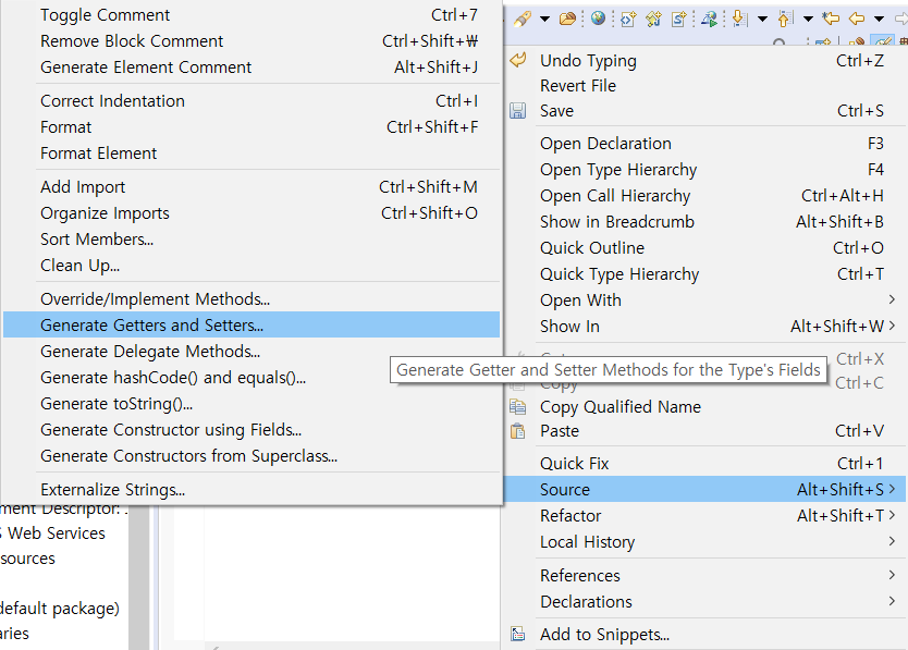 Getter와 Setter 이클립스에서 쉽게 만드는 방법은 다들 아시리라고 생각해요.하지만 만에 하나 모르는 분을 위해 알려드리자면