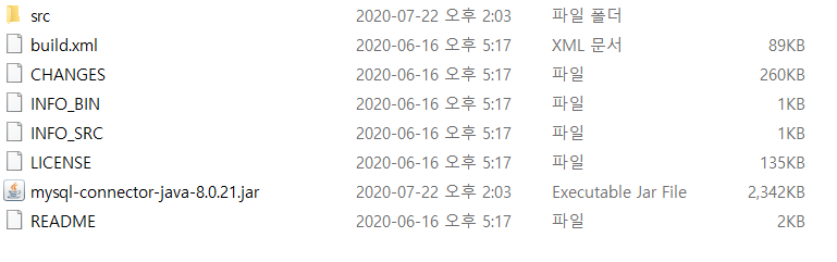 압축을 풀면 여러 파일들이 있는데 우리가 필요한 건 mysql-connector-java-버전.jar 파일입니다.