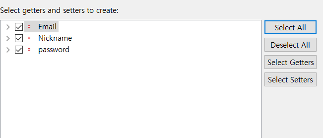 Select All로 모든 변수에 대해 Getters와 Setters를 만들어줍시다.