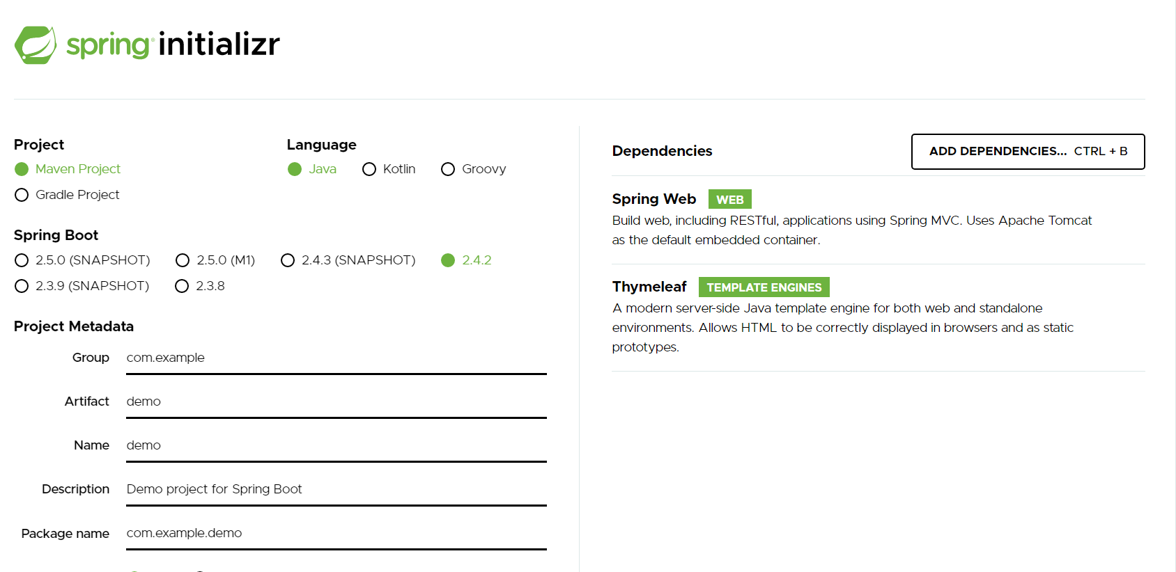 저는 웹을 개발할 것이고 템플릿 엔진으로는 Thymeleaf를 사용할 예정이라 두 가지만 추가해뒀습니다.