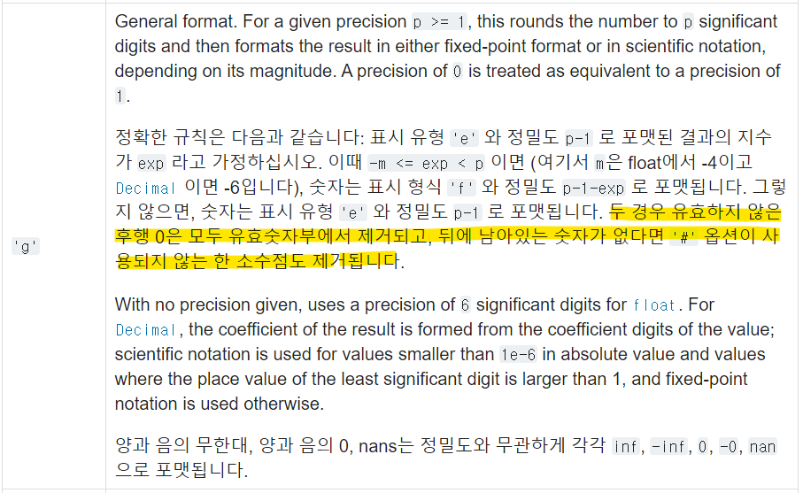 'g' 포맷팅에 관한 내용에서 중요한 부분을 형광펜으로 칠해봤습니다. 유효하지 않은 후행 0은 모두 유효숫자부에서 제거되는 특성이 있기에 해당 문제에서 사용할 수 있었습니다.