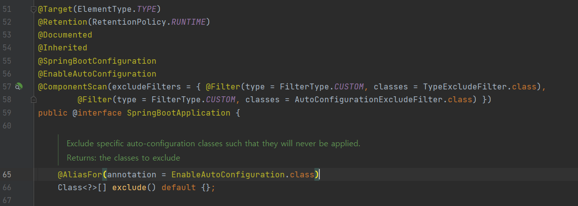 그 위의 @SpringBootApplication 가 오늘 살펴볼 어노테이션입니다.