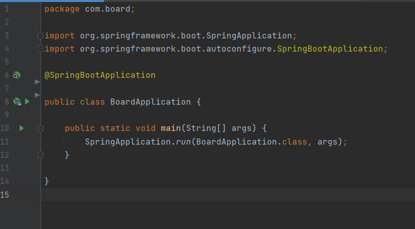 메서드 선언부에는 main 메서드 하나만 선언되어 있고 SpringApplication.run 메서드를 호출해서 웹 애플리케이션을 실행합니다.