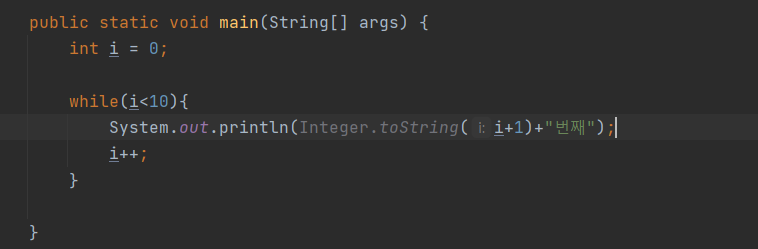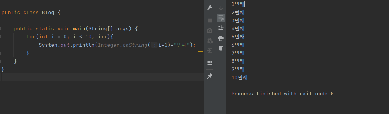 저는 0부터 시작하는게 편해서 i라는 변수를 0으로 초기화해줬습니다. 그다음 0부터 9까지가 10개이므로 조건식도 적절하게 써주고, i가 0부터 9까지 하나씩 증가해야 하므로 ++ 증감식을 사용해줬습니다. i+=1을 써도 상관없으나 일반적인 경우 제가 작성한 포맷을 가져갑니다. 또한 수행돼야 할 구문으로는 단순하게 총 몇 번 돌고 있는지 출력하도록 해줬습니다.