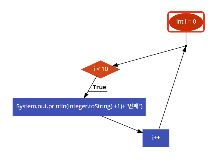 위의 코드를 플로우 차트로 표현하면 이렇게 됩니다. 초기화는 맨 처음 한 번만 이뤄집니다. 그러고 조건문을 보죠. 결과가 참이라면 수행되야할 구문으로 넘어갑니다. 그 다음에 증감식 파트로 이동하고, 다시 조건문~ 의 플로우를 따릅니다. 매번 초기화가 일어나지는 않는 점. 증감식은 괄호 안의 내용이 수행된 다음에 실행된다는 점. 이 두 가지를 알려드리고 싶었습니다.